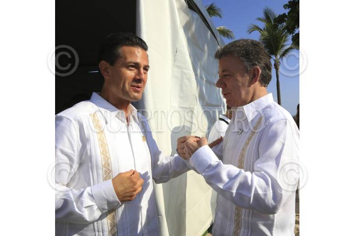 PUNTA MITA, NAYARIT, 20JUNIO2014.- Enrique Peña Nieto, presidente de México, saluda a su homólogo de la República de Colombia, Juan Manuel Santos en el marco de la Novena Cumbre de la Alianza del Pacífico. FOTO: CUARTOSCURO.COM