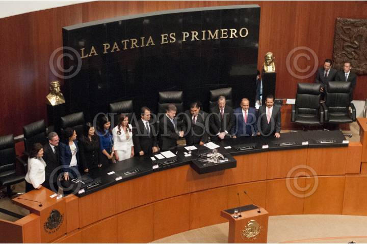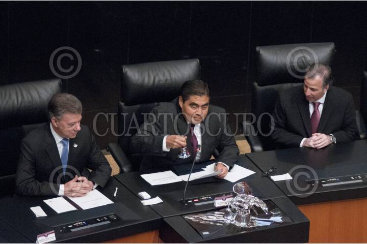 MÉXICO, D.F., 08MAYO2015.- Juan Manuel Santos, presidente de Colombia, Miguel Barbosa Huerta, presidente de la Mesa Directiva del Senado, y José Antonio Meade, Secretario de Relaciones Exteriores, durante la sesión solemne de la Comisión Permanente del Congreso de la Unión en el Senado de la República. FOTO: DIEGO SIMÓN SÁNCHEZ /CUARTOSCURO.COM