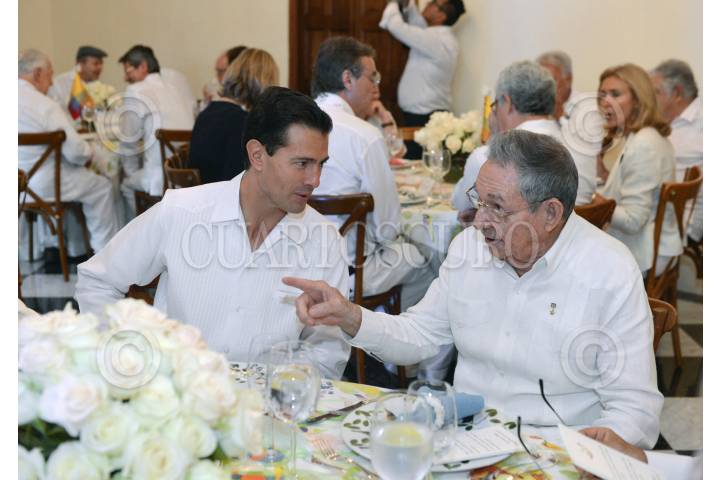 CARTAGENA DE INDIAS, COLOMBIA, 26SEPTIEMBRE2016.- El Presidente mexicano, Enrique Peña Nieto, y el Mandatario de Cuba, Raúl Castro, conversaron hoy durante el almuerzo que ofreció el Presidente de Colombia, Juan Manuel Santos, en honor de los Jefes de Estado y de Gobierno invitados a la Ceremonia Protocolaria de la Firma de la Paz. FOTO: PRESIDENCIA /CUARTOSCURO.COM