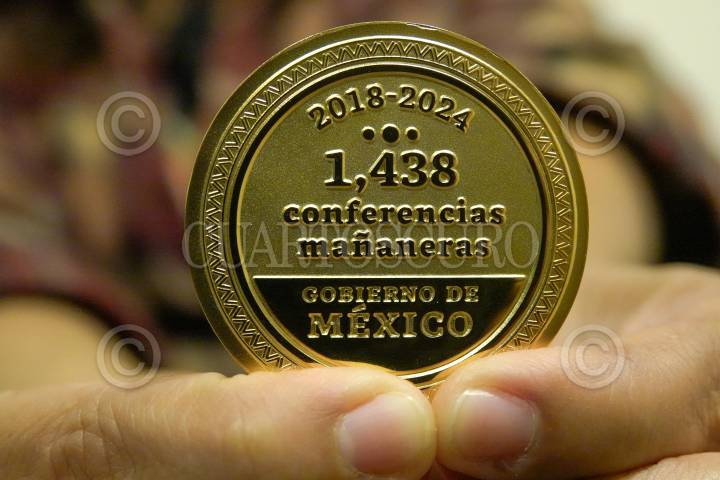 CIUDAD DE MÉXICO, 30SEPTIEMBRE2024.- Moneda conmemorativa por las 1,438 mañaneras de Andrés Manuel López Obrador, Presidente de México, fue distribuida como obsequio entre los periodistas que cubrieron una gran cantidad de las mismas durante los actos conmemorativos por el fin de su gestión. FOTO: CUARTOSCURO.COM