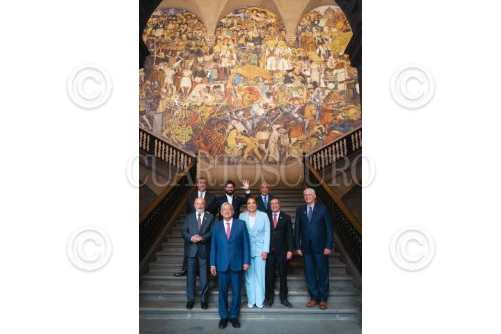 CIUDAD DE MÉXICO, 30SEPTIEMBRE2024.- Andrés Manuel López Obrador, Presidente de México, posa con los presidentes y presidenta: Luiz Inácio Lula da Silva (Brasil); Xiomara Castro (Honduras); Miguel Diaz-Canel (Cuba); Gustavo Petro (Colombia), y Gabriel Boric (Chile), en los murales de Palacio Nacional, ahí comieron como parte de su agenda de fin de gobierno.
