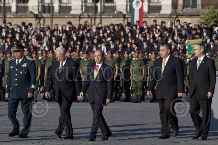 MÉXICO, D.F., 24FEBRERO2012.- El presidente Felipe Calderón acompañado de Guillermo Galvan, secretario de la Defensa Nacional; Juan Silva Meza, ministro presidente de la Suprema Corte de Justicia; Guadalupe Acosta, presidente de la mesa directiva de la Cámara de Diputados y José Gonzalez Morfin, presidente de la Cámara de Senadores durante la ceremonia por el Día de la Bandera que se celebró en la Plaza de la Constitución. FOTO: RODOLFO ANGULO /CUARTOSCURO.COM