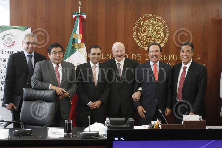 MÉXICO, D.F. 18ENERO2013.- Los senadores Salvador Vega Casilla, Ernesto Cordero, presidente de la Cámara de Senadores, Emilio Gamboa y Omar Fayad, se reunieron con Manuel Mondragón, subsecretario de planeación y protección institucional de la Secretaría de Gobernación (al centro de la imagen), en la Junta de Coordinación Política de la Cámara Alta. FOTO: MOISÉS PABLO /CUARTOSCURO.COM
