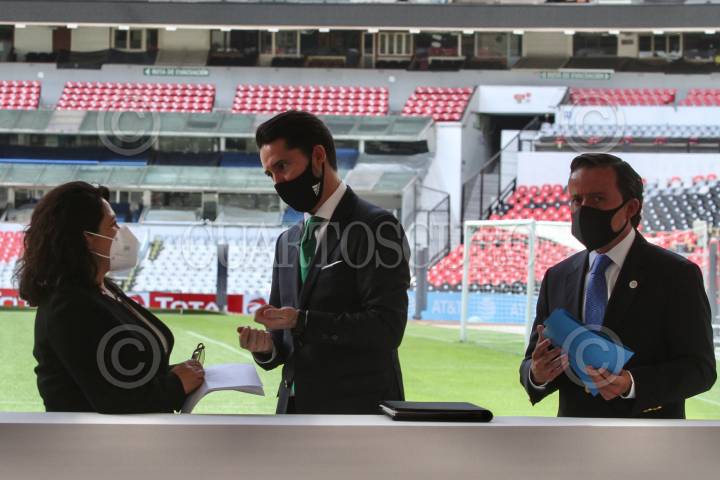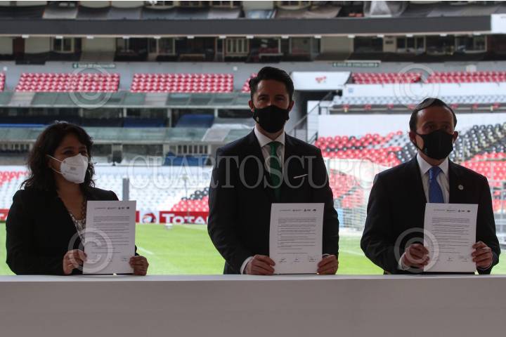 Irasema Zavaleta, Yon de Luisa y Mikel Arriola, durante la conferencia en donde se presentó la iniciativa "Grita México" en el Estadio Azteca.