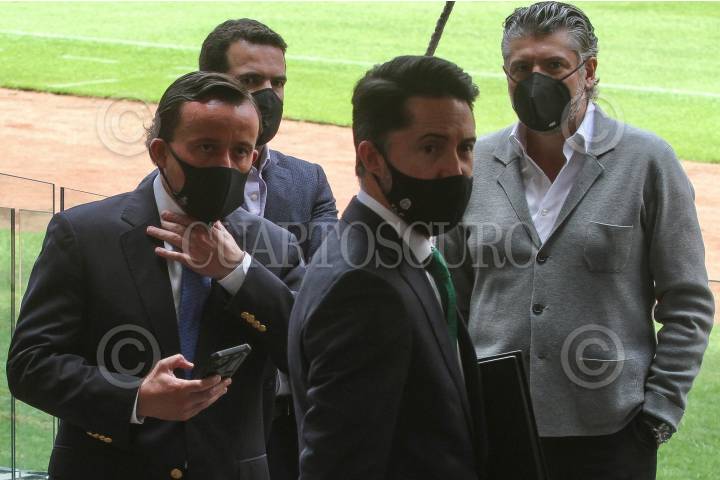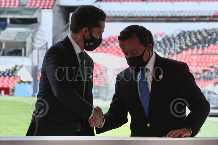 Mikel Arriola y Yon de Luisa momentos antes de la conferencia en donde se presentó la iniciativa "Grita México" en el Estadio Azteca.