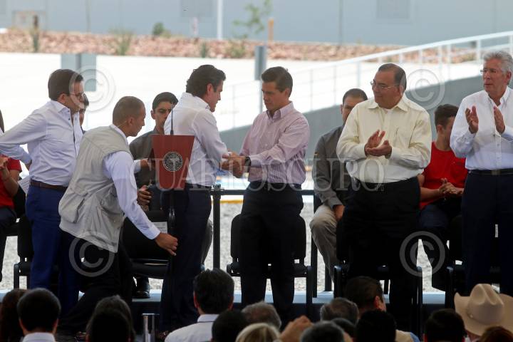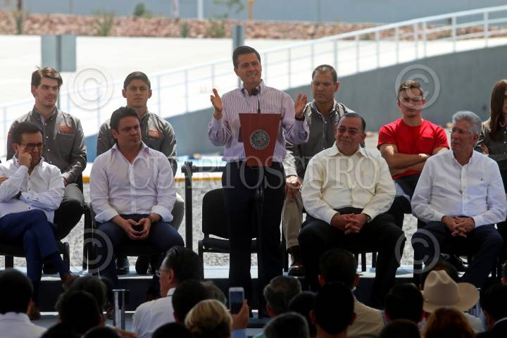 LAGOS DE MORENO, JALISCO. 22JUNIO2017.- Enrique Peña Nieto, Presidente de la Republica, Jorge Aristóteles Sandoval Díaz, Gobernador del Estado, Ildefonso Guajardo, Secretario de Economía, Gerardo Ruiz Esparza, Secretario de Comunicaciones y transportes y demás autoridades de la entidad, encabezaron la inauguración del nuevo Parque Industrial Colinas de Lagos en ya mencionado municipio. FOTO: FERNANDO CARRANZA GARCIA / CUARTOSCURO.COM