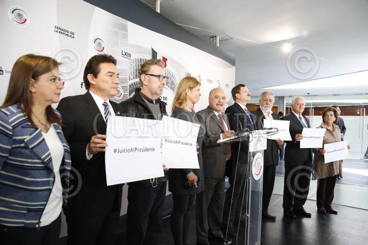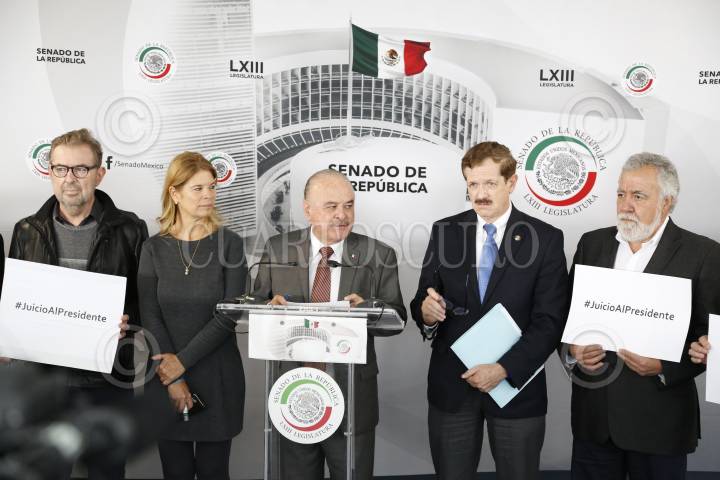 CIUDAD DE MÉXICO, 07DICIEMBRE2017.- Los senadores panistas Marcela Torre Peimbert, Ernesto Ruffo Appel, Juan Carlos Romero Hicks, junto con el senador independiente Alejandro Encinas, dieron a conocer que buscan modificar la Constitución para que el Presidente de la República también pueda ser sujeto de juicio político, así como ser acusado por hechos de corrupción y violaciones a la Constitución Política. FOTO: CUARTOSCURO.COM