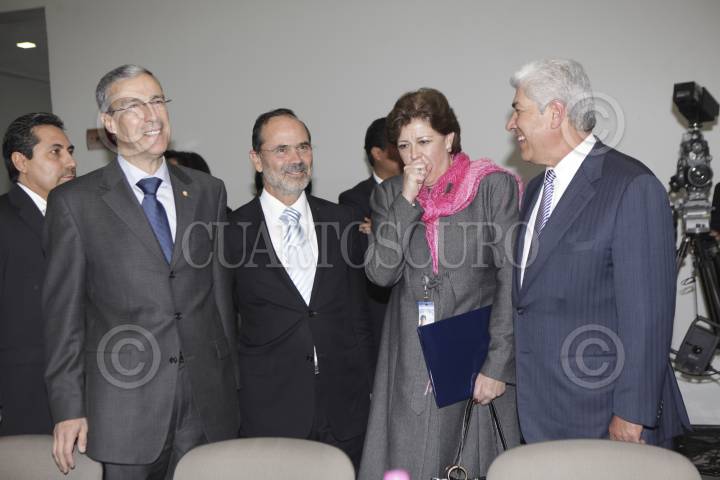 MÉXICO, D.F., 27AGOSTO2012.- Ernesto Cordero, nuevo presidente de la mesa directiva del Senado de la República, Jesus Zambrano, presidente de la mesa directiva del PRD, Gustavo Madero, presidente del PAN, Miguel Barboza, senador del PRD, y Gabriela Cuevas, senadore del PAN, charlan durante una reunión privada que sostuvieron esta mañana en la cual revisaron la agenda legislativas. FOTO: CUARTOSCURO.COM