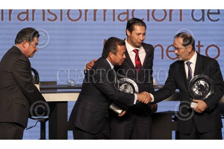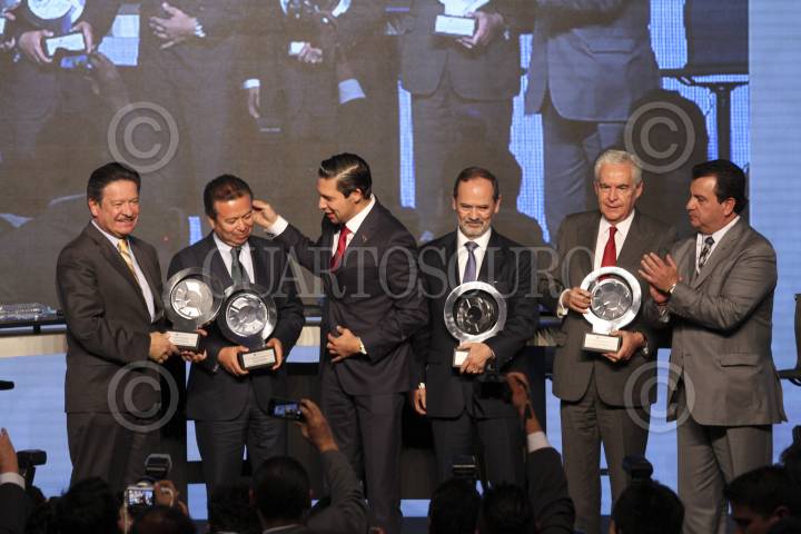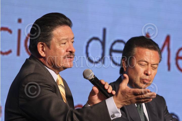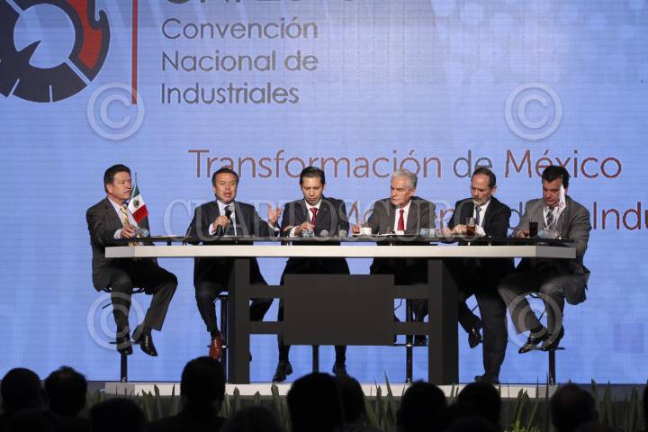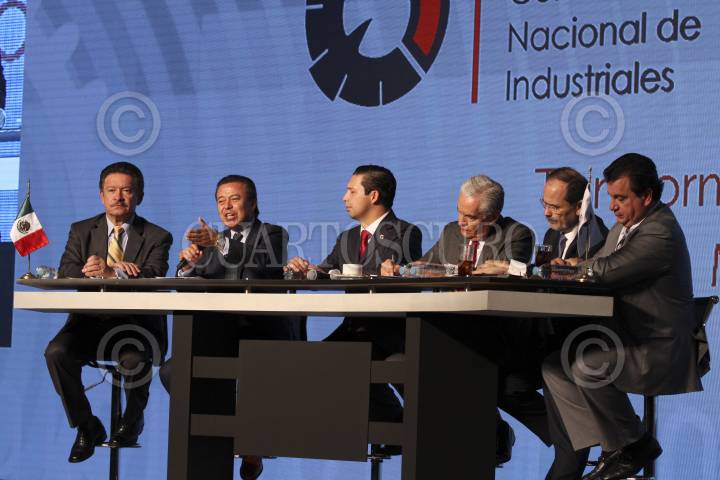 MÉXICO, D.F., 26MARZO2015.- Cesar Camacho Quiroz presidente del PRI, Carlos Navarrete, presidente del PRD, Gustavo Madero, presidente del PAN, Alfonso Zárate Flores, analista politico y Rodrigo Alpízar Vallejo, de la Cámara Nacional de la Industria, durante la convención 2015 de la Cámara Nacional de la Industria. FOTO: SAÚL LÓPEZ /CUARTOSCURO.COM