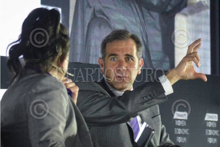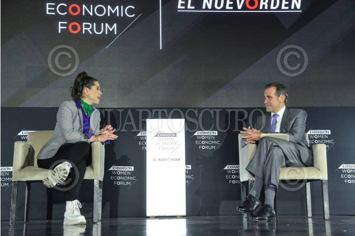 Lorenzo Córdova, consejero presidente del Instituto Nacional Electoral (INE), y la periodista Yuridia Sierra, durante su participación en el "Women Economic Forum" (WEF) Iberoamérica 2022 con la temática "Sin mujeres no hay democracia".