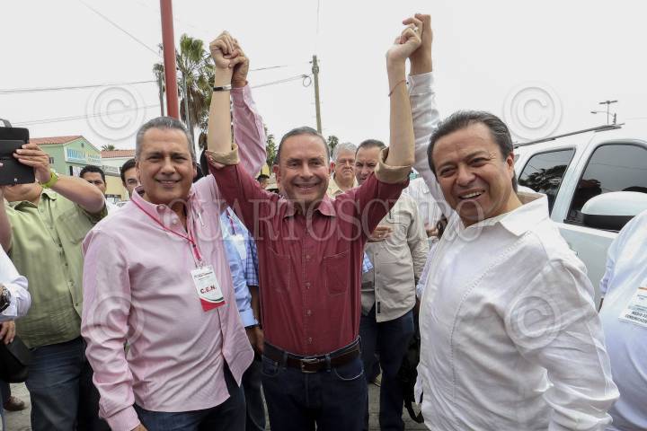 TIJUANA, BAJA CALIFORNIA, 07JULIO2013.-Manlio Fabio Beltrones, Coordinador del PRI en la Camara de Diputados junto a Fernando Castro Trenti candidato a gobernador por el PRI y Cesar Camacho Quiroz, Presidente Nacional del PRI durante la votacion de Castro Trenti en la casilla basica del distrito 8 en Playas de Tijuana. FOTO: CUARTOSCURO.COM