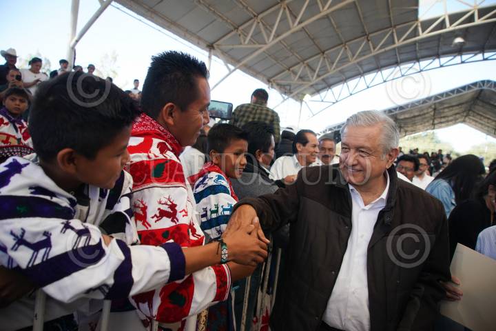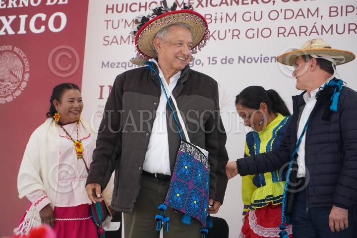 SAN FRANCISCO DEL MEZQUITAL, DURANGO, 15NOVIEMBRE2019.- El presidente de los Estados Unidos Mexicanos, Andrés Manuel López Obrador en Diálogo con el pueblo indígena tepehuano del sur, huichol, mexicanero, cora y tarahumara en el Albergue Indígena de San Francisco del Mezquital, Durango. Lo acompañan José Rosas Aispuro Torres, gobernador de Durango y Adelfo Regino Montes, director general del Instituto Nacional de los Pueblos indígenas (INPI). FOTO: PRESIDENCIA /CUARTOSCURO.COM