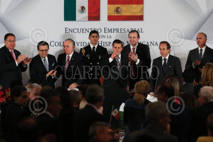 CIUDAD DE MÉXICO, 20OCTUBRE2017.- Enrique Peña Nieto, presidente de México, acompañado de Valentín Diez Morodo, presidente del Consejo Empresarial Mexicano del Comercio Exterior, Inversión y Tecnología Idelfonso Guajardo Villareal Secretario de Economia y el embajador de España, Luis Fernández-Cid de las Alas Pumariño, durante el encuentro empresarial de la colectividad mexicana realizado en la Hacienda de los Morales. FOTO: SAÚL LÓPEZ /CUARTOSCURO.COM
