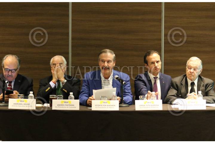CIUDAD DE MÉXICO, 16JUNIO2017.- Vicente Fox Quezada ex presiente de México (al centro) acompañado de los ex presidentes Andrés Pastrana, Jorge Tutto Quiroga, de Bolivia, Miguel Ángel Rodríguez de Costa Rica y Asdrúbal Aguiar, director ejecutivo de la organización IDEA, en conferencia de prensa dieron a conocer que los ex mandatarios latinoamericanos firmaron una carta para solicitar cese la violencia en Venezuela. FOTO: SAÚL LÓPEZ /CUARTOSCURO.COM