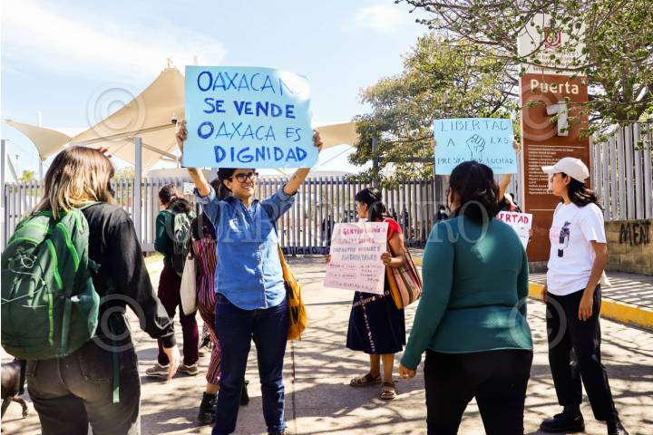 SAN BARTOLO COYOTEPEC, OAXACA, 29ENERO2024.- Un grupo de activistas protestaron en la Puerta 1 de la Ciudad Judicial, ubicada en el municipio conurbado de San Bartolo Coyotepec, para exigir la liberación de cuatro de los seis activistas detenidos el pasado sábado 27 de enero luego de su participación en la primera marcha contra la gentrificación en Oaxaca. Los manifestantes que reiteraron su rechazo a la gentrificación de la capital oaxaqueña, detallaron que dos activistas ya fueron liberadas sin embargo han sufrido el acoso de las autoridades; además acusaron uso desmedido de la fuerza, violación a derechos humanos y al debido proceso. FOTO: CAROLINA JIMÉNEZ/CUARTOSCURO.COM