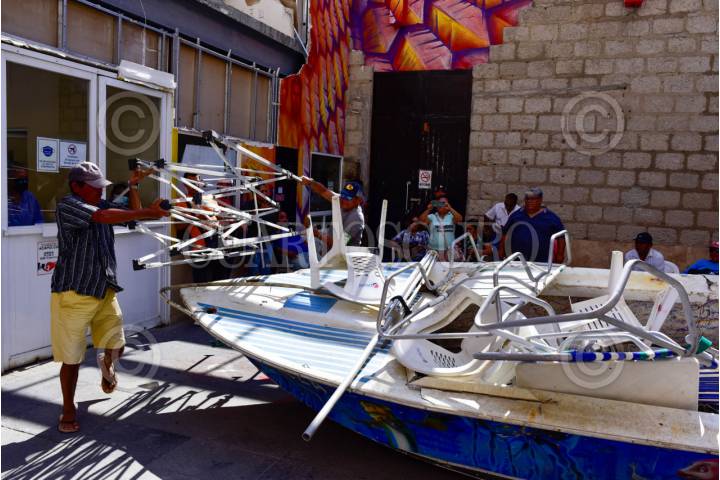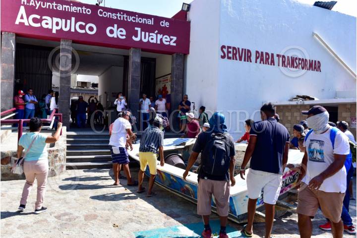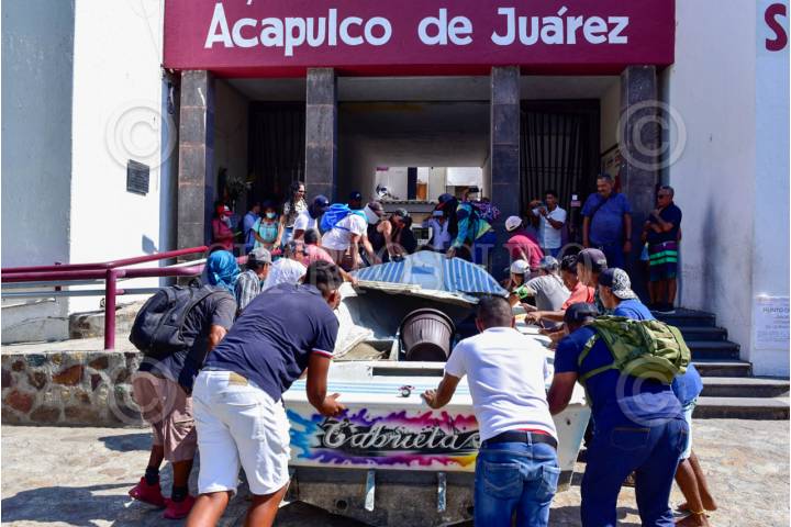 ACAPULCO, GUERRERO, 11MARZO2024.- Prestadores de servicios turísticos de playa protestaron en el ayuntamiento de Acapulco, para exigir la destitución de su cargo al secretario de turismo municipal, David Abarca, ya que más de 4 meses del paso del huracán Otis, no ha informado en que se están gastando los 47 millones de pesos que esa secretaria recibió para mejorar los daños que causó el huracán. Los manifestantes llevaron mobiliario de playa como sillas, mesas y sombrillas, y una lancha dañada por el huracán, el cual dejaron a las afueras de la sala de cabildo. FOTO: CARLOS ALBERTO CARBAJAL/CUARTOSCURO.COM