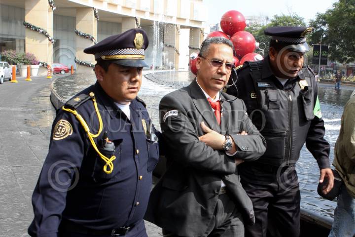 MÉXICO, D.F., 28NOVIEMBRE2010.- Un elemento de seguridad privada de la empresa Total Safety de Plaza Antara, quien presuntamente dio la orden de "retirar" al fotógrafo de la agencia AP Marco Ugarte mientras realizaba su labor periodística, es detenido por elementos de seguridad pública después de que paramedicos atendieran al fotógrafo golpeado por los elementos de dicha empresa. FOTO: RODOLFO ANGULO/CUARTOSCURO.COM