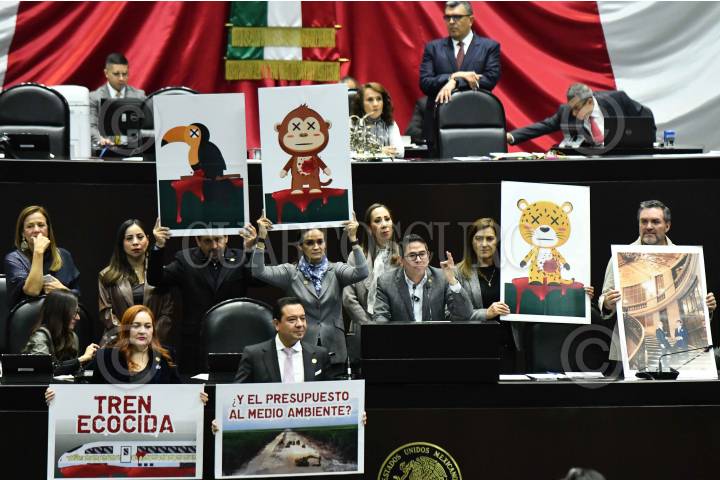 CIUDAD DE MÉXICO, 11DICIEMBRE2024.- Fidel Daniel Chimal, diputado del PAN, y sus compañeros de bancada protestan durante la sesión ordinaria de la Cámara de Diputados en la que se discute el presupuesto de egresos para el ejercicio fiscal 2025. FOTO: MARIO JASSO/CUARTOSCURO.COM