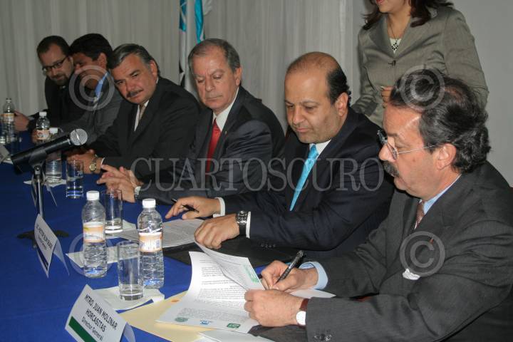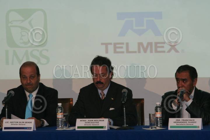 MÉXICO, D.F., 06OCTUBRE2008.- Esta tarde, el Director General de la Empresa Teléfonos de México (Telmex), Héctor Slim Seade, Maestro Juan Molinar Horcasitas, Director General del IMSS, el ingeniero Francisco hernandez Juarez; realizarón la firma de convenios -PREVENIMSS-. FOTO: ENRIQUE ORDÓÑEZ/CUARTOSCURO.COM