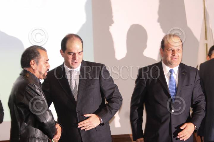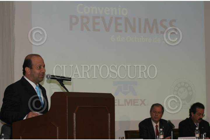 MÉXICO D.F., 08MARZO2010.- Francisco Hernández Suárez, secretario general del Sindicato de Telefonistas, Daniel Karam, Director del IMSS y Héctor Slim, Director de Telmex, durante la firma del convenio PREVENIMSS con Telmex, en las instalaciones de esta compañía telefónica. FOTO: GUILLERMO PEREA/CUARTOSCURO.COM