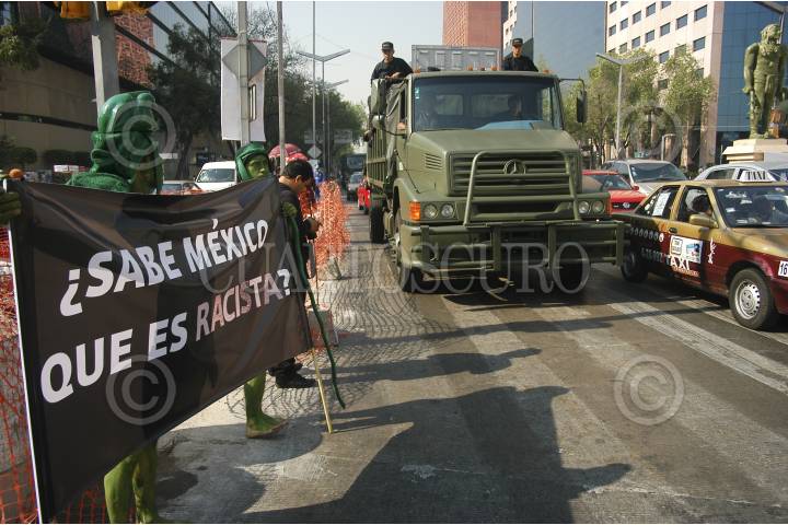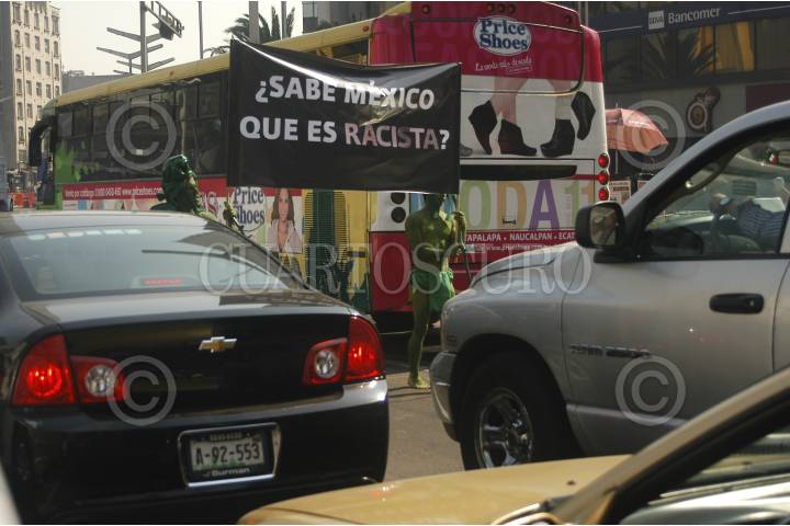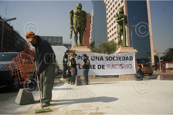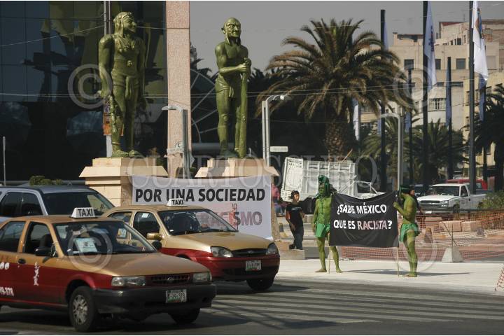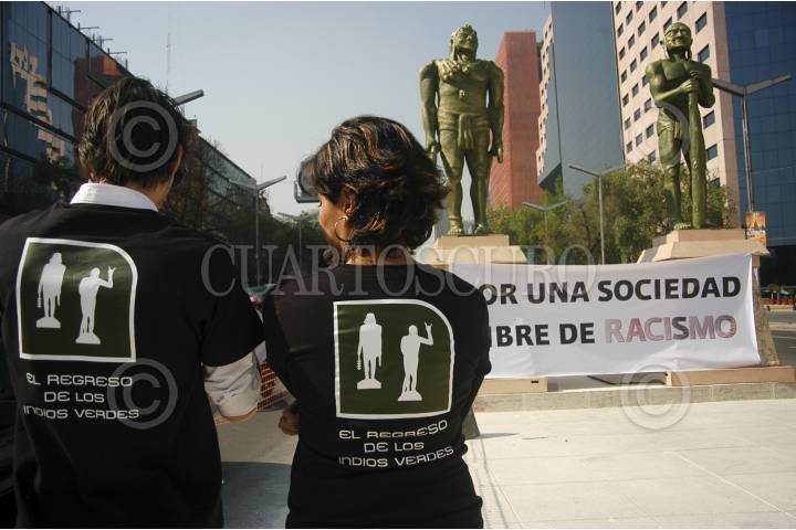 MÉXICO, D.F., 07DICIEMBRE2011.- Integrantes de la Consejo Nacional para Prevenir el Delito (Conapred), colocaron en avenida Paseo de la Reforma y Juárez un par de Indios Verdes que representan a Icóaltl y Ahuizotl con la que comenzaron una campaña en contra del racismo en México. FOTO: GUILLERMO PEREA/CUARTOSCURO.COM