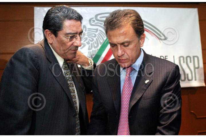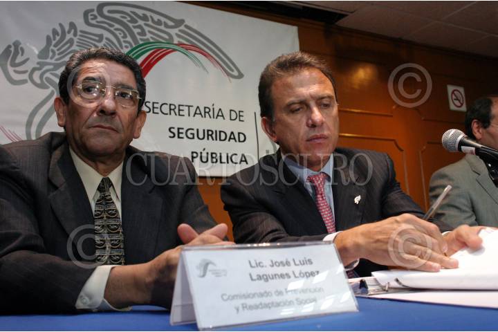 MEXICO, D.F. 26ENERO2005.- José Luis Lagunes López, comisionado de Prevención y Readaptación Social y Miguel Angel Yunes, subsecretario de Prevención y Participación Ciudadana, ofrecieron una conferencia de prensa en las instalaciones de la Secretaría de Seguridad Pública Federal. FOTO: Moisés Pablo/CUARTOSCURO.COM