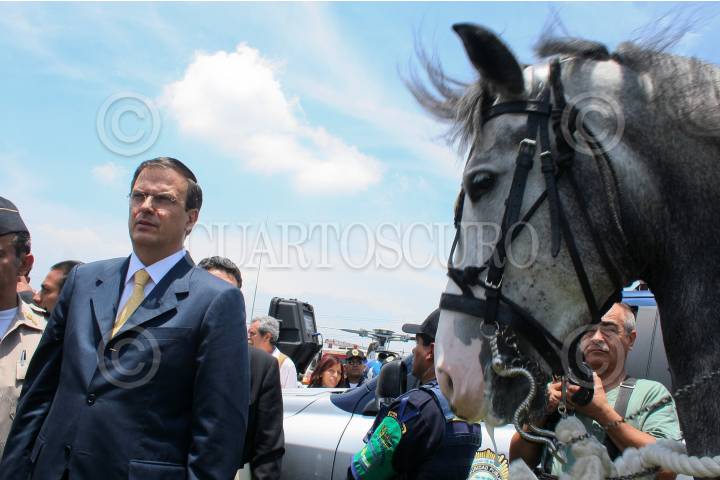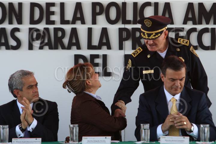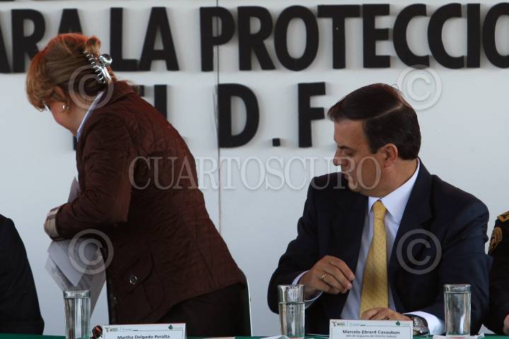 MÉXICO, D.F., 01JULIO2009.- Miguel Angel Mancera procurador de justicia del Distrito Federal, Martha Delgado secretaria de Medio Ambiente, Manuel Mondragon y Marcelo Ebrard jefe de gobierno capitalino durante la presentación de la policía ambiental y cuerpo de brigadistas para la protección de suelo de conservacion de la ciudad, esta policía realizara acciones preventivas, como la vigilancia en parajes con mayor incidencia de tala clandestina, patrullajes para inhibir el cambio de uso de suelo o evitar el deposito de residuos de construcción y otras sustancias toxicas para el medio ambiente. FOTO:RICARDO CASTELAN/CUARTOSCURO.COM