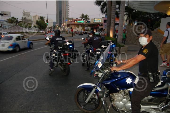 ACAPULCO, GUERRERO, 30ABRIL2009.- Ante la situación que se viven en el país por el virus de la Influenza, Policías preventivos de Acapulco como medida preventiva comenzaron a utilizar tapabocas por el dialogo directo que tienen con turistas nacionales y extranjeros. FOTO: MARINO D. VALDEZ/CUARTOSCURO.COM