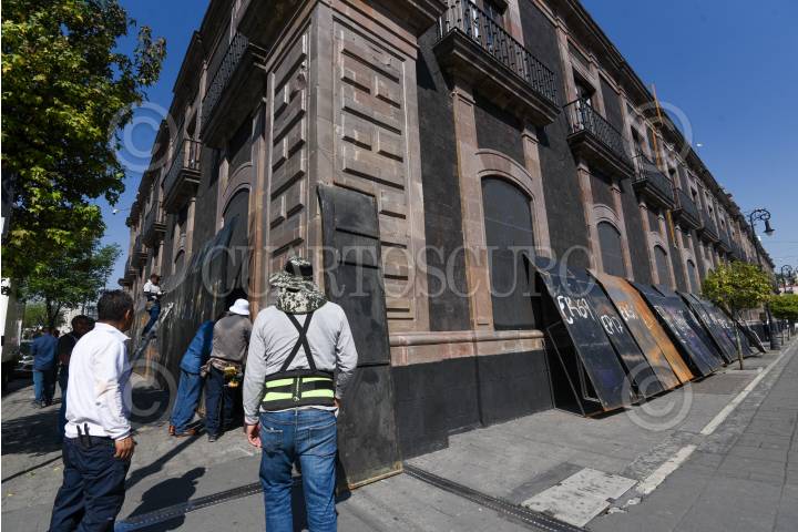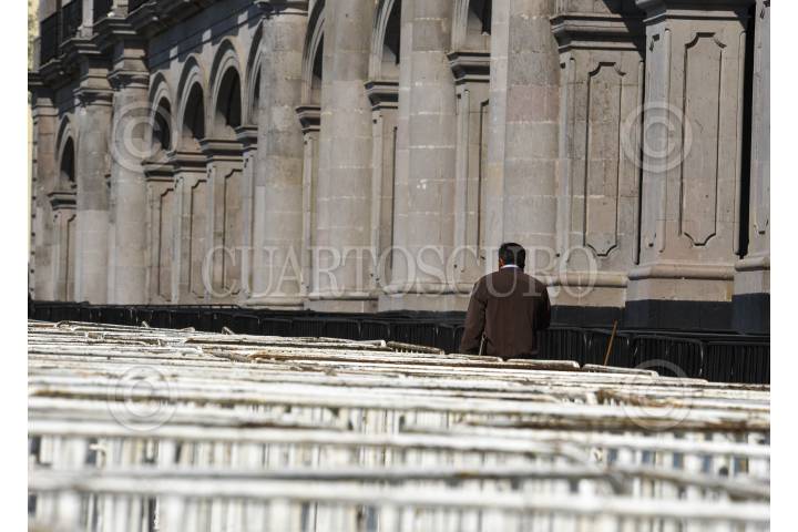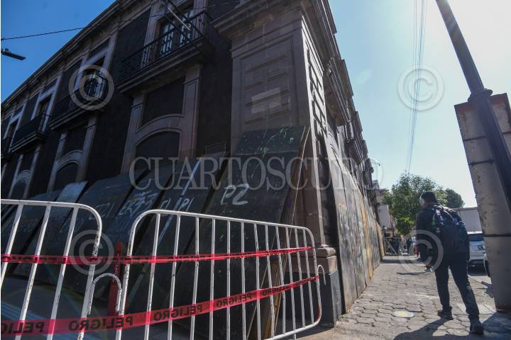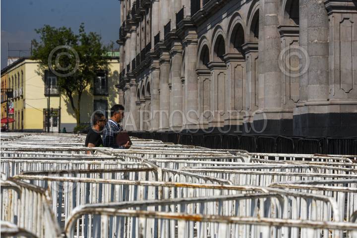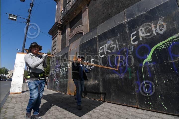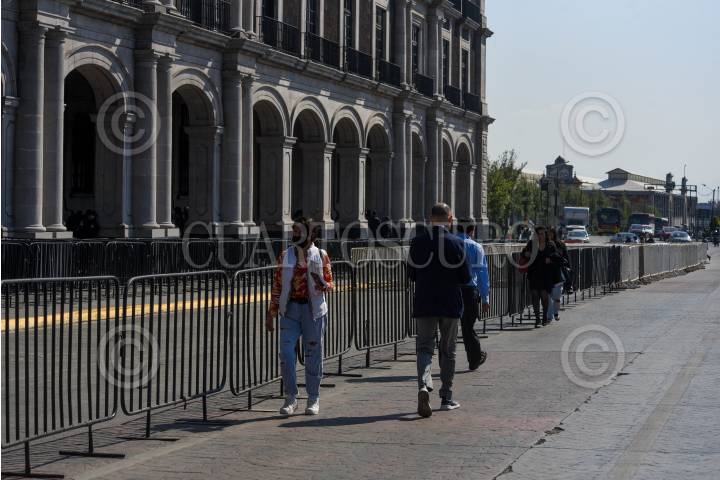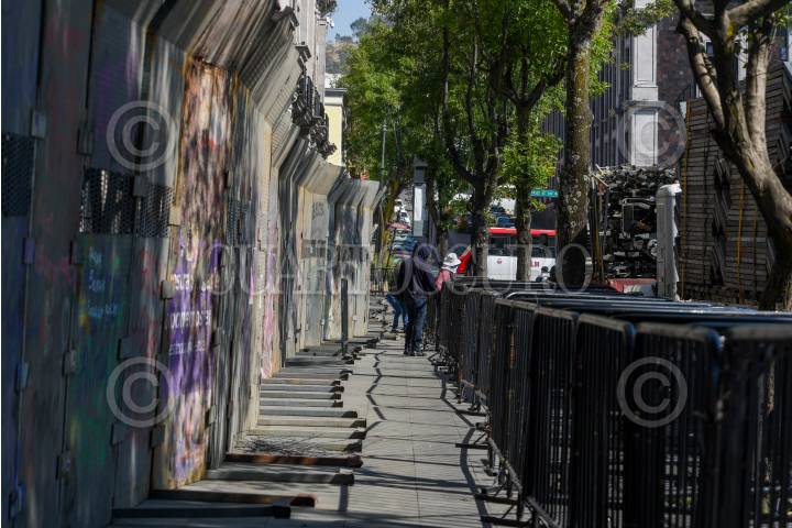 TOLUCA, ESTADO DE MÉXICO, 06MARZO2025.- Previo a las marchas del 8M ya se inició con la colocación de vallas metálicas en los edificios de Palacio de Gobierno, la Cámara de Diputados local y el Poder Judicial, los ciudadanos tienen caminar por abajo de las banquetas por los obstáculos que representan estas vallas y arriesgando su integridad. FOTO: CRISANTA ESPINOSA AGUILAR /CUARTOSCURO.COM