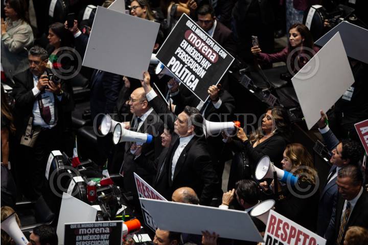 CIUDAD DE MÉXICO, 01SEPTIEMBRE2025.- Protesta del grupo parlamentario del PRI durante Sesión Congreso General inició del primer periódico de sesiones ordinarias del segundo año de ejercicio LXVI legislatura. FOTO: ANDREA MURCIA /CUARTOSCURO.COM