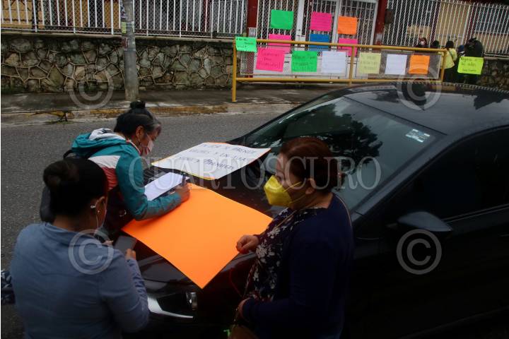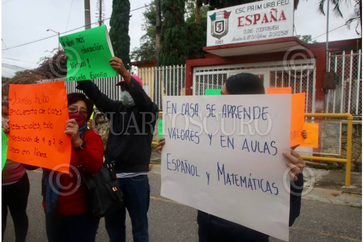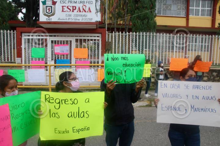 Padres de familia de la primaria España en Oaxaca se manifestaron afuera del plantel para exigir que ya regresen a clases presenciales, ya que denunciaron que el director se negó al afirmar que no hay condiciones para un retorno seguro.