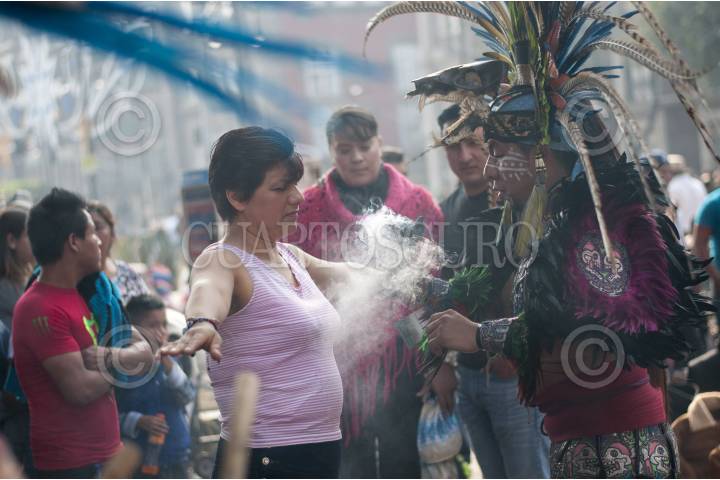 MÉXICO, D.F., 01ENERO2016.- Miles de familias aprovechan el primer día del año para salir al centro histórico y disfrutar de sus atracciones turísticas y comerciales. Algunos se dan el tiempo para realizarse una limpia con los concheros como una forma de purificarse y alejar las malas vibras. FOTO: DIEGO SIMÓN SÁNCHEZ /CUARTOSCURO.COM
