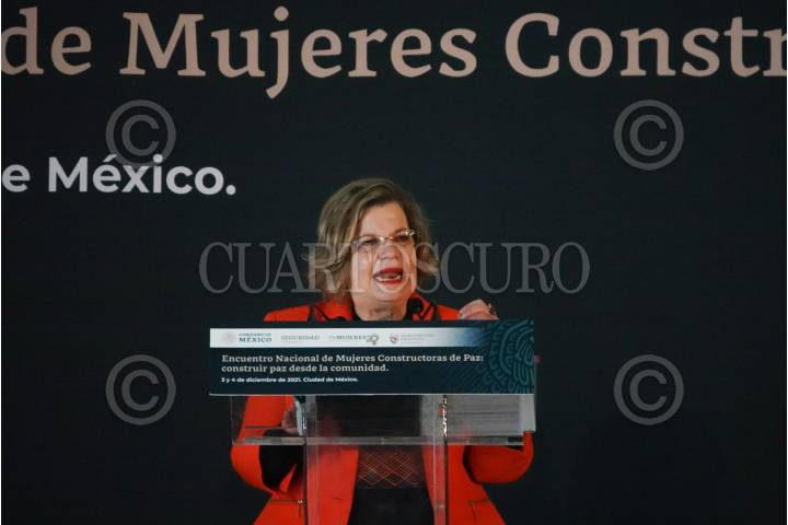 María Fabiola Alanis Sámano, comisionada Nacional para Prevenir y Erradicar la Violencia contra las Mujeres, durante la conferencia del Encuentro Nacional de Mujeres Constructoras de Paz por el 45 aniversario de la primer encuentro de mujeres en Tlatelolco.