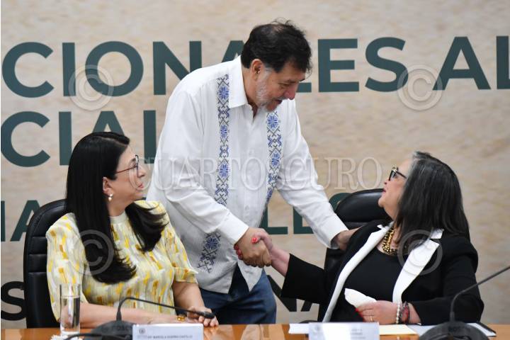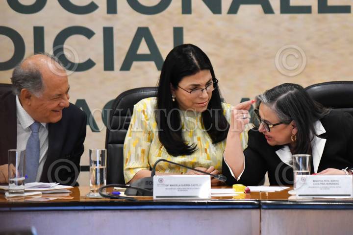 CIUDAD DE MÉXICO, 27JUNIO2024.- Juan Ramiro Robledo, diputado presidente de la Comisión de Puntos Constitucionales; Marcela Guerra, presidenta de la mesa directiva de la Cámara de Diputados, y Norma Piña, ministra presidenta de la SCJN, durante la primer mesa del "Diálogos nacionales sobre la reforma constitucional al poder judicial" realizado en el salón del protocolo de la Cámara de Diputados. FOTO: MARIO JASSO/CUARTOSCURO.COM