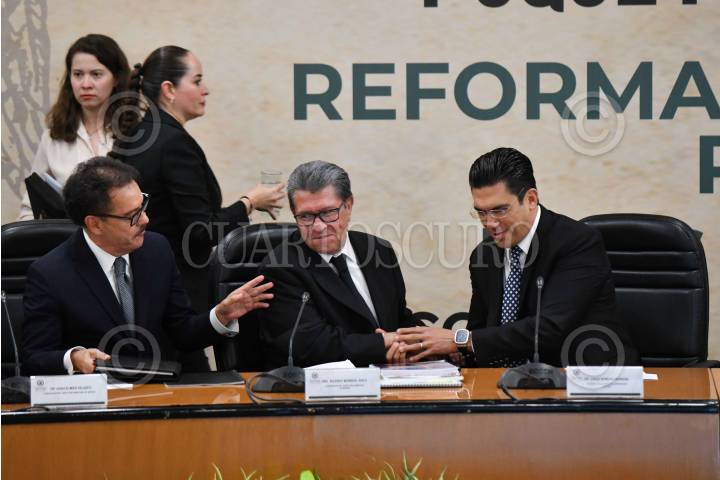 CIUDAD DE MÉXICO, 27JUNIO2024.- Ignacio Mier, diputado coordinador de Morena; Ricardo Monreal, senador coordinador de Morena y Jorge Romero, diputado presidente de la Junta de Coordinación Política (JUCOPO), durante la primer mesa del "Diálogos nacionales sobre la reforma constitucional al poder judicial" realizado en el salón del protocolo de la Cámara de Diputados. FOTO: MARIO JASSO/CUARTOSCURO.COM