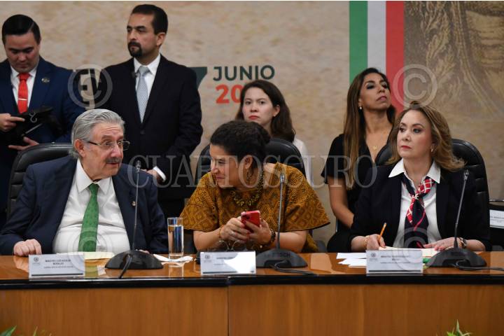 CIUDAD DE MÉXICO, 27JUNIO2024.- Juan Ramiro Robledo, diputado presidente de la comisión de Puntos Constitucionales; Marcela Guerra, presidenta de la mesa directiva de la Cámara de Diputados; Ignacio Mier, diputado coordinador de Morena; Yazmín Esquivel, ministra de la SCJN; Norma Piña, ministra presidenta de la SCJN; y Rubén Moreira, diputado coordinador del PRI, durante la primer mesa del "Diálogos nacionales sobre la reforma constitucional al poder judicial" realizado en el salón del protocolo de la Cámara de Diputados. FOTO: MARIO JASSO/CUARTOSCURO.COM