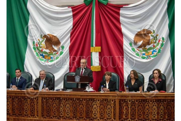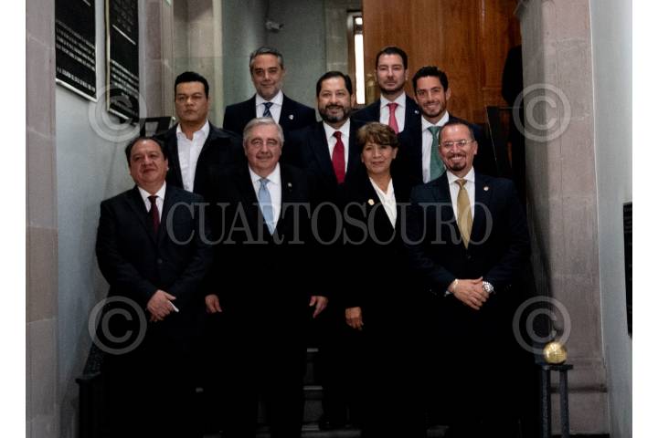 TOLUCA, ESTADO DE MÉXICO, 05SEPTIEMBRE2024.- Delfina Gómez Álvarez, Gobernadora del Estado de México, Ricardo Sodi Cuéllar, Magistrado Presidente del TSJEM, los coordinadores de MORENA, PVEM, PT, PAN, PRI, PRD y MC, Francisco Vázquez, José Couttolenc, Óscar González, Pablo Fernández de Ceballos, Elías Rescala, Omar Ortega y Juan Zepeda durante la Sesión Solemne de Apertura del Primer Periodo Ordinario de Sesiones del Primer Año de Ejercicio Constitucional de la LXII Legislatura. FOTO: CRISANTA ESPINOSA AGUILAR /CUARTOSCURO.COM