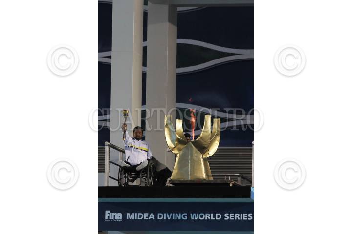 ZAPOPAN, JALISCO, 01OCTUBRE2013.- Hoy en el Centro Acuático Panamericano se llevo a cabo la Inauguración de los XL Juegos Nacionales Deportivos Sobre Silla de Ruedas Guadalajara 2013, misma que encabezo la primera Dama de México, Angélica Rivera, así como el Gobernador del Estado, Jorge Aristóteles Sandoval Díaz, entre otras personalidades federales, estatales y deportivas. Arnulfo Castorena fue el encargado de encender el pebetero de los juegos. FOTO: FERNANDO CARRANZA /CUARTOSCURO.COM