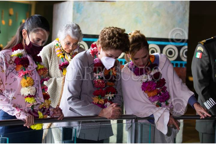 Claudia Sheinbaum, Jefa de Gobierno; Olga Sánchez Cordero, secretaria de Gobernación; Dilma Rousseff, ex presidenta Brasileña, y Beatriz Gutiérrez Müller, esposa del Presidente de México, durante la ceremonia por los “700 años de la fundación de México-Tenochtitlán”, en el Templo Mayor.