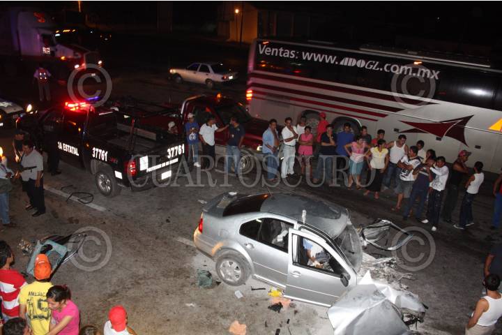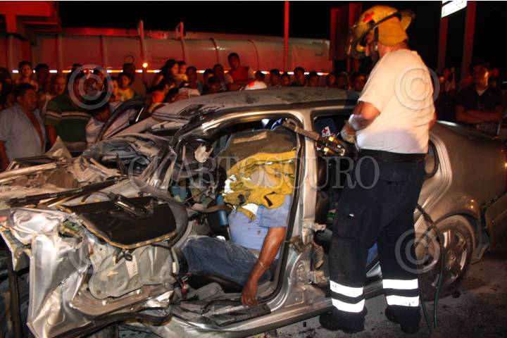 CUNDUACAN, TABASCO, 22AGOSTO2010.- Un hombre de aproximadamente 35 años de edad pierde la vida en un hecho de transito terrestre sobre la vía federal Villahermosa-Càrdenas a la altura del Paso Cunduacan a primeras horas de hoy. Los hechos acontecieron cuando el automóvil tipo Jetta era conducido a exceso de velocidad y bajo los influjos del alcohol comisionando contra un trailers; en el lugar pierde la vida el conductor, mientras dos personas más se debaten entre la vida y muerte. FOTO: MARCO POLO GUZMÁN HERNÁNDEZ/CUARTOSCURO.COM