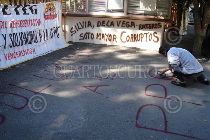 CHILPANCINGO, GUERRERO 06 DE DICIEMBRE 2006.- Integrantes de la Coordinadora Estatal por la Reivindicacion de los Principios de la CETEG encabezados por su dirigente Nicolas Chavez Adame, protestaron en las oficinas del secretario de educacion Jose Luis de la Vega Otero para exigir la entrega de los creditos del Programa de Prevision Social (PPS) antes CEBE. FOTO: OSCAR ALVARADO/CUARTOSCURO.COM