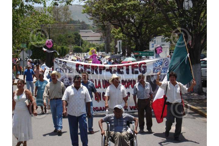 CHILPANCINGO, GUERRERO. 01JUNIO2007.- Integrantes de la Asamblea Popular de los Pueblos de Guerrero (APPG), de la Coordinadora Estatal por la Reivindicacion de los Principios de la CETEG (CERP-CETEG), de la Union de Campesinos Emiliano Zapata (UCEZ), comuneros opositores a la Parota y comuneros de Carrizalillo realizaron una marcha por las principales calles y avenidas de la capital del estado para exigir la derogacion de la Ley del ISSSTE asi como para exgir la entrega de fertilizante entre otras demandas. En la imagen un aspecto de la marcha. FOTO: OSCAR ALVARADO/CUARTOSCURO.COM