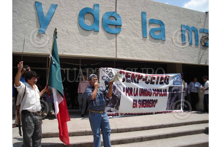CHILPANCINGO, GUERRERO. 01JUNIO2007.- Integrantes de la Asamblea Popular de los Pueblos de Guerrero (APPG), de la Coordinadora Estatal por la Reivindicacion de los Principios de la CETEG (CERP-CETEG), de la Union de Campesinos Emiliano Zapata (UCEZ), comuneros opositores a la Parota y comuneros de Carrizalillo realizaron una marcha por las principales calles y avenidas de la capital del estado para exigir la derogacion de la Ley del ISSSTE asi como para exgir la entrega de fertilizante entre otras demandas. En la imagen durante el mitin que realizaron afuera de la clinica del ISSSTE. FOTO: OSCAR ALVARADO/CUARTOSCURO.COM