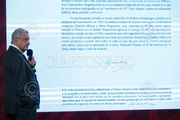 Andrés Manuel López Obrador muestra la carta que hizo llegar días antes al presidente de Argentina Alberto Fernández sobre una visita de Beatríz Gutiérrez Müller a la región del Cono Sur.