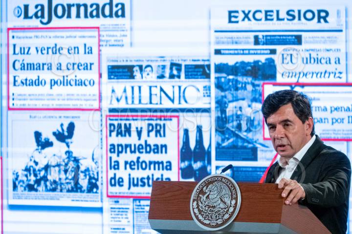 Ricardo Mejía Berdeja explica la importancia en la figura de Prisión Preventiva Oficiosa durante la conferencia matutina en Palacio Nacional.