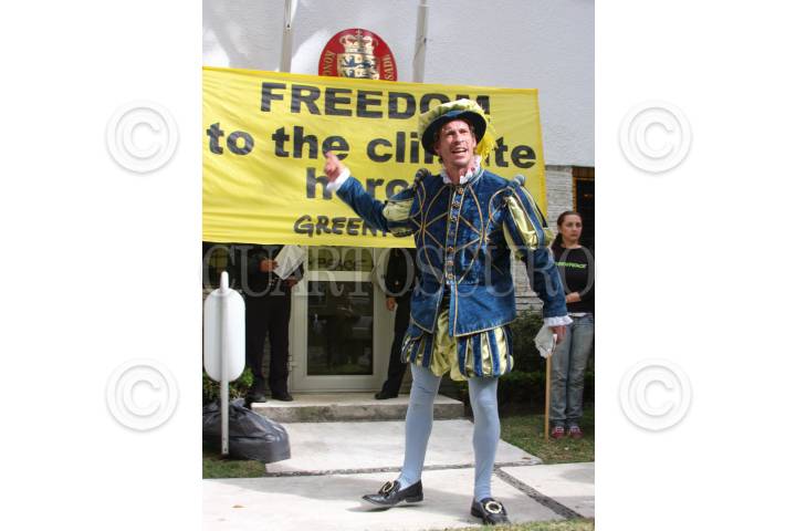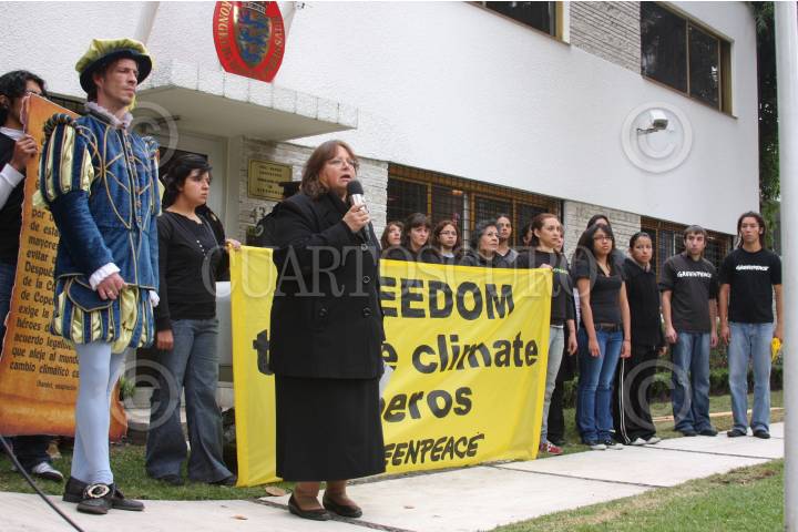 MÉXICO D.F., 23DICIEMBRE2009.- Activistas de Greenpeace, se manifestaron a las afueras de la embajada de Dinamarca para exigir la liberación de cuatro personas que fueron puestas en prisión en dicho país durante la reunión sobre cambio climático. FOTO: CUARTOSCURO.COM