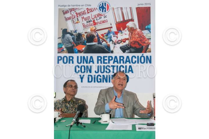 MÉXICO, D.F., 25JUNIO2015.- Sergio Naranjo e Iván Moscoso, de la Agrupación de Exprisioneros Políticos de Chile en México, ofrecieron una conferencia de prensa para manifestar su solidaridad con exprisioneros políticos que mantienen una huelga de hambre desde el pasado 23 de abril en Chile debido a la falta de ayuda por parte del gobierno. FOTO: DIEGO SIMÓN SÁNCHEZ /CUARTOSCURO.COM