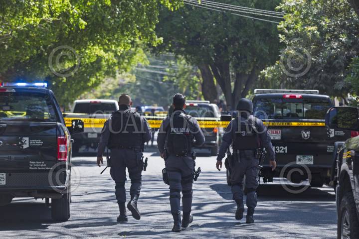 Policías de Guadalajara caminan por la zona donde se registro un enfrentamiento entre policías municipales y civiles armados en la colonia Chapalita.