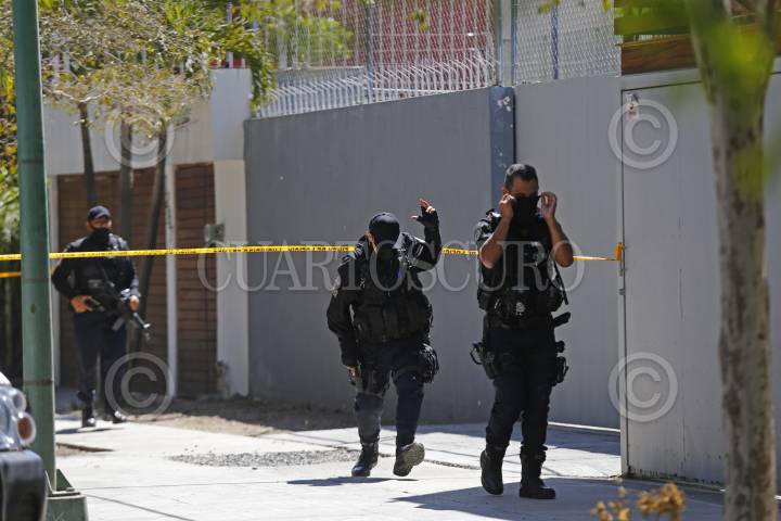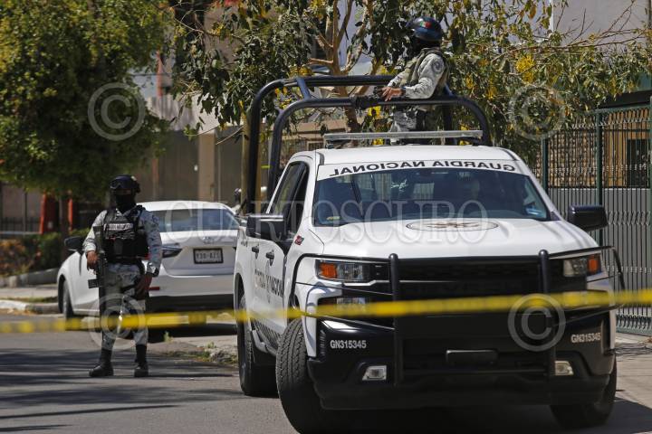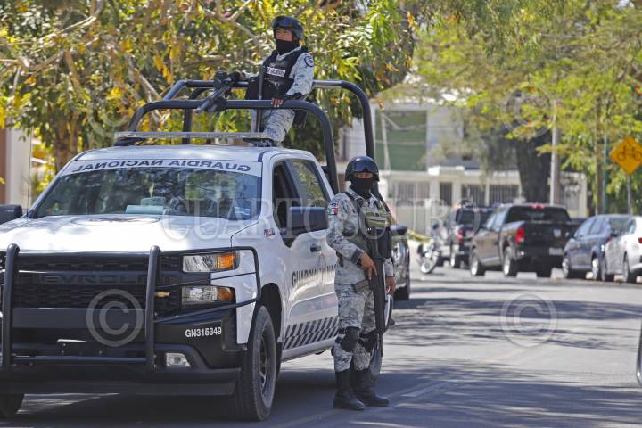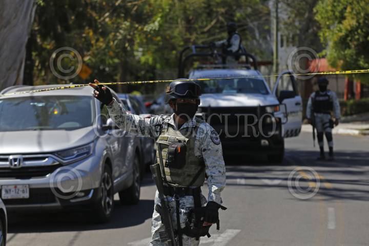 Personal de la Guardia Nacional resguardan la zona donde se registro un enfrentamiento entre policías municipales y civiles armados en la colonia Chapalita.