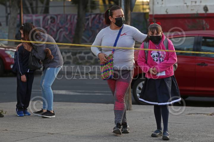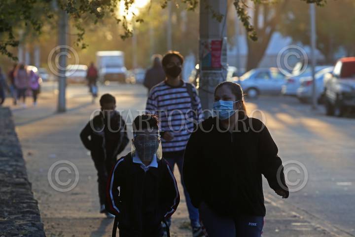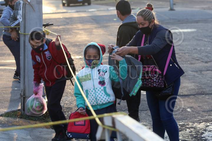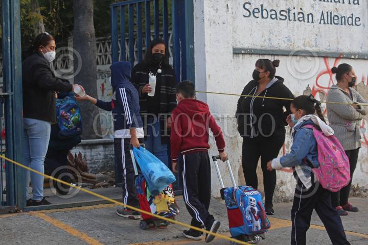Alumnos de la Primaria Sebastián Allende, ubicada al oriente de la ciudad, caminan para asistir a clases hoy, después del periodo vacacional invernal.